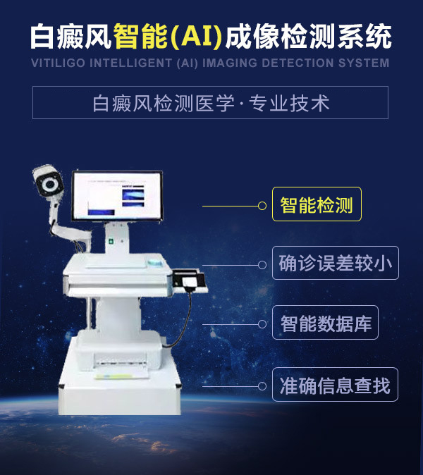 白癜风智能(AI)成像检测系统,通过采用新的LED技术,将获得的波长为365±2nm的长波UVA光源照射病变部位,病变部位产生强弱不一的折光,经高清高分辨率的彩色传感器,获得病变部位的图像;并通过皮肤影像分析功能,自动对焦和抖动识别,实现皮损部位与正常皮肤的对比,分析色素缺失程度,精准辨识病症是否白癜风;同时根据皮损状态下的黑色素细胞形态、数量,出具诊断结果。