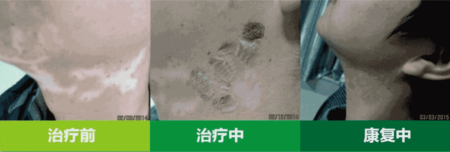 吴某,脖子白斑,建筑工人,经常风吹日晒,刚开始黑色素脱失的不是很严重,医院说是汗斑,结果吃药,擦药没什么效果,白斑却蔓延到了下巴。因为这女朋友跟他分了手,来了我们医院后,苏建平教授针对病因治疗,才一个多疗程,就已经恢复。